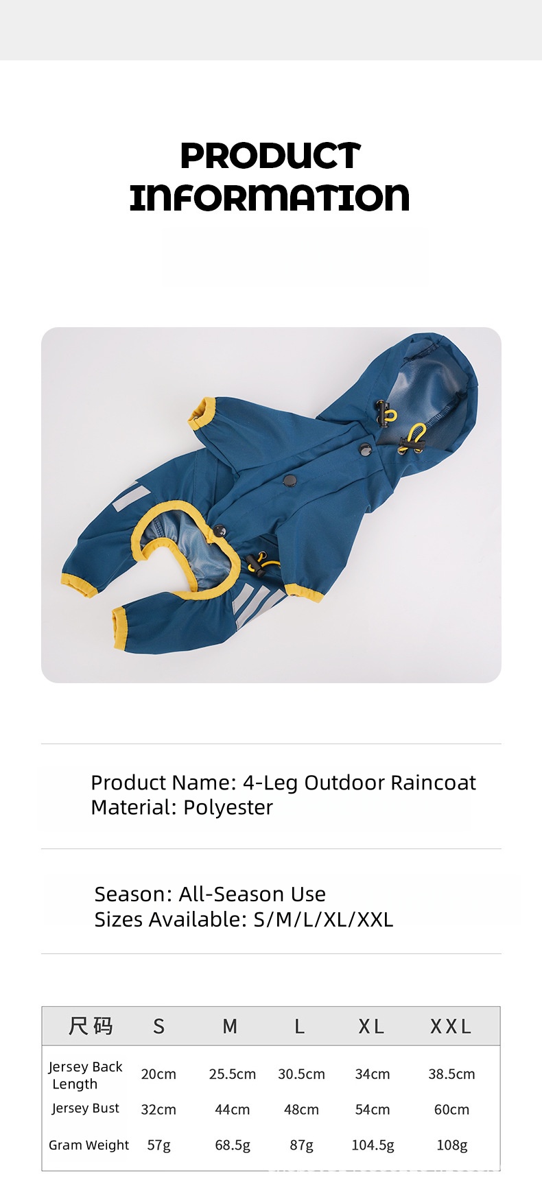 - اختيار المقاس - صُممت هذه السترة الواقية من المطر خصيصًا للكلاب الصغيرة والمتوسطة. تتوفر سلالات الكلاب المختلفة بأشكال وأحجام مختلفة، لذا يُرجى قياس مقاس الكلب والرجوع إلى جدول المقاسات لاختيار المقاس المناسب قبل الشراء. في حال وجود أي استفسار، يُرجى التواصل معنا.