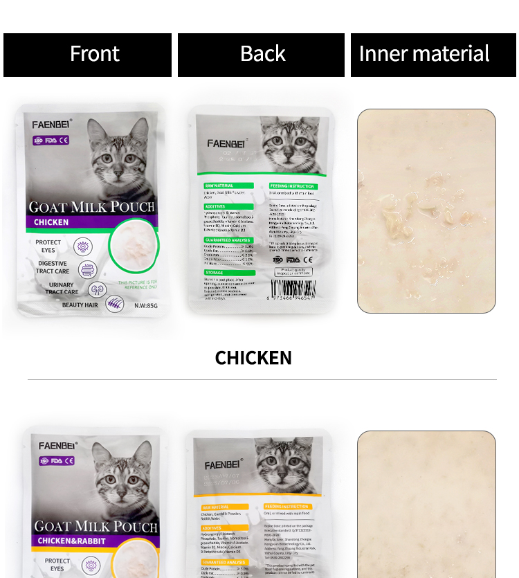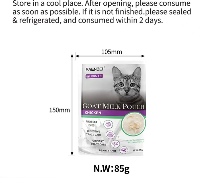 Petiscos para animais de estimação Pacotes de leite de cabra Petiscos para gatos Pacotes de comida úmida Leite de cabra 85g