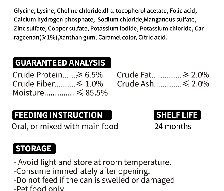 Сырой протеин ≥6,5% (лучший показатель в отрасли!), сырой жир ≥2,0%, влажность ≤85,5%, концентрированное питание для максимального насыщения!